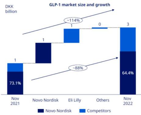 - GLP-1 market explosion: The global obesity drug market is expected to reach $100 billion by 2030, with Eli Lilly and Novo Nordisk duopoly. Zepbound quickly captured 56% of new prescriptions in the U.S. after its launch, with demand far outstripping supply.