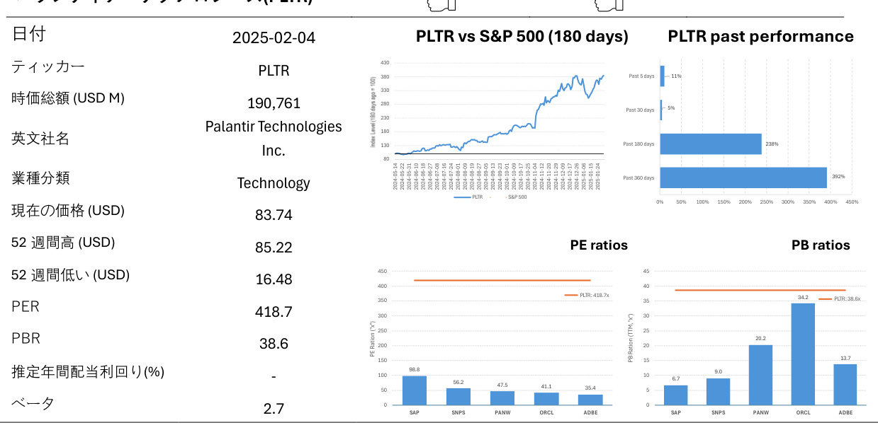 As at February 04, 2025, PLTR has a price-to-earnings (P/E) ratio of 418.7 and a price-to-book (P/B) ratio of 38.6. Compared to the October 2024 report, it has a TTM (rolling) P/E ratio of 253.6 and a forward P/E ratio of 108.56. This is well above the average P/E ratio of the technology sector (typically 20-40x), indicating that the market has extremely high expectations for its future earnings, but the risk premium is significant.