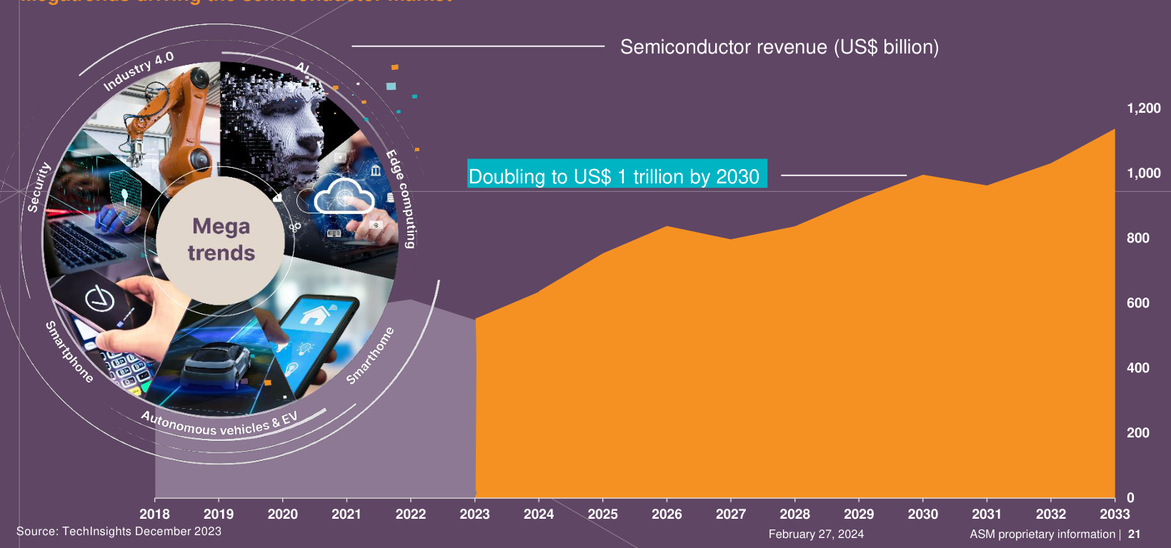 The global semiconductor market will grow by 16% to $611 billion in 2024, driven by demand for AI chips and high-bandwidth memory. The market is expected to double to $1 trillion by 2030.