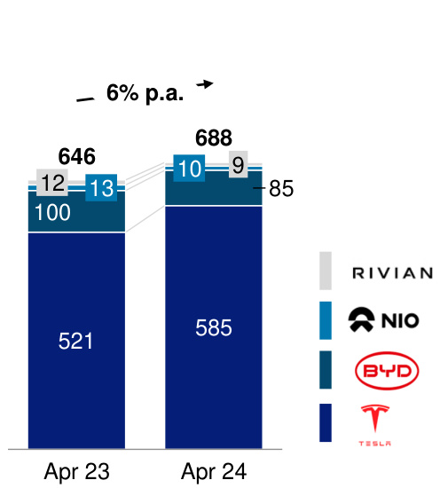 The global EV market is expected to reach US$802.8 billion in 2027 (CAGR 22.6%), but Rivian needs to overcome capacity bottlenecks (deliveries in 2024 will only be 1.5% of Tesla’s) and increase brand penetration. Analysts predict that its market share could increase slightly to 4.5% in 2025.