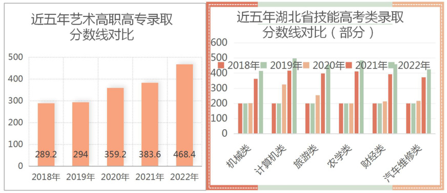 - 高职高专类:全国最低投档线持续下降,2018-2022年从289.2分升至468.4分(艺术类),技能高考分数线因专业不同波动显著。
